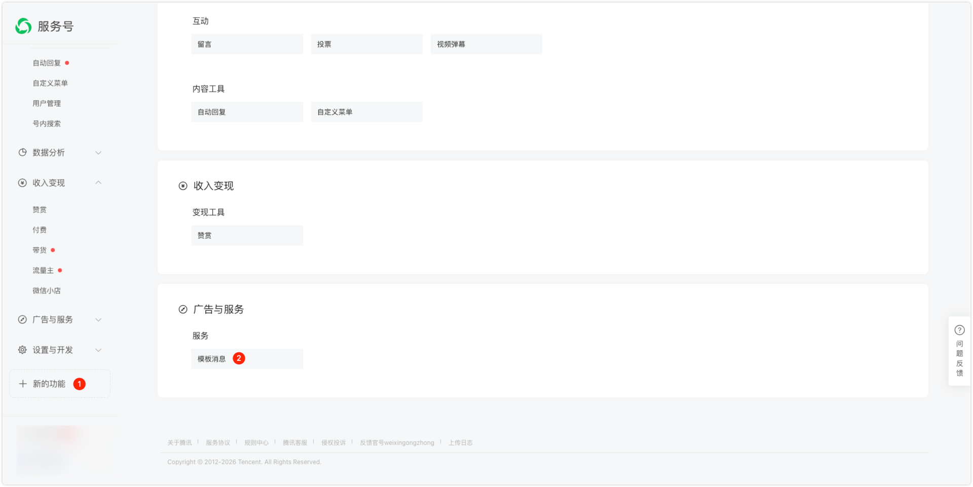 如果侧边栏没有模板消息,则需要开通此功能,开通入口如下: