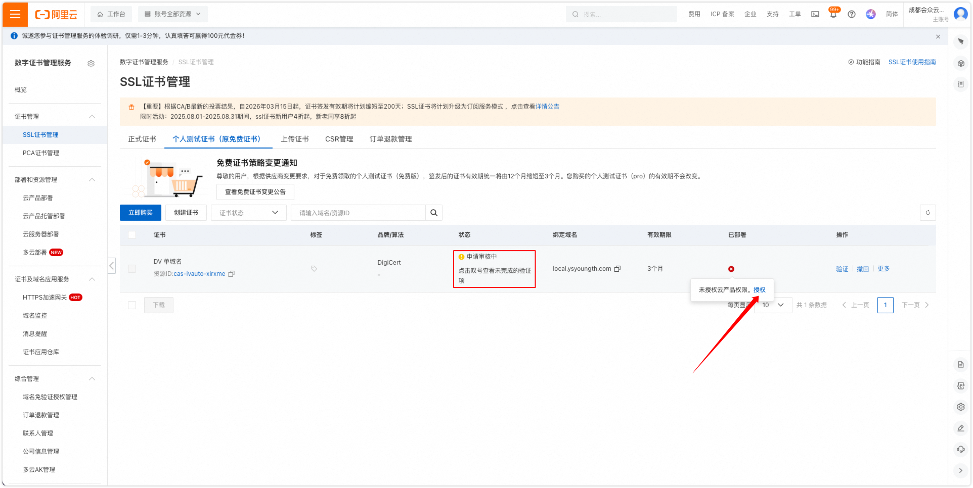 运行插件后,插件将自动请求阿里云签发证书,由于阿里云的安全机制,需要再次进行授权