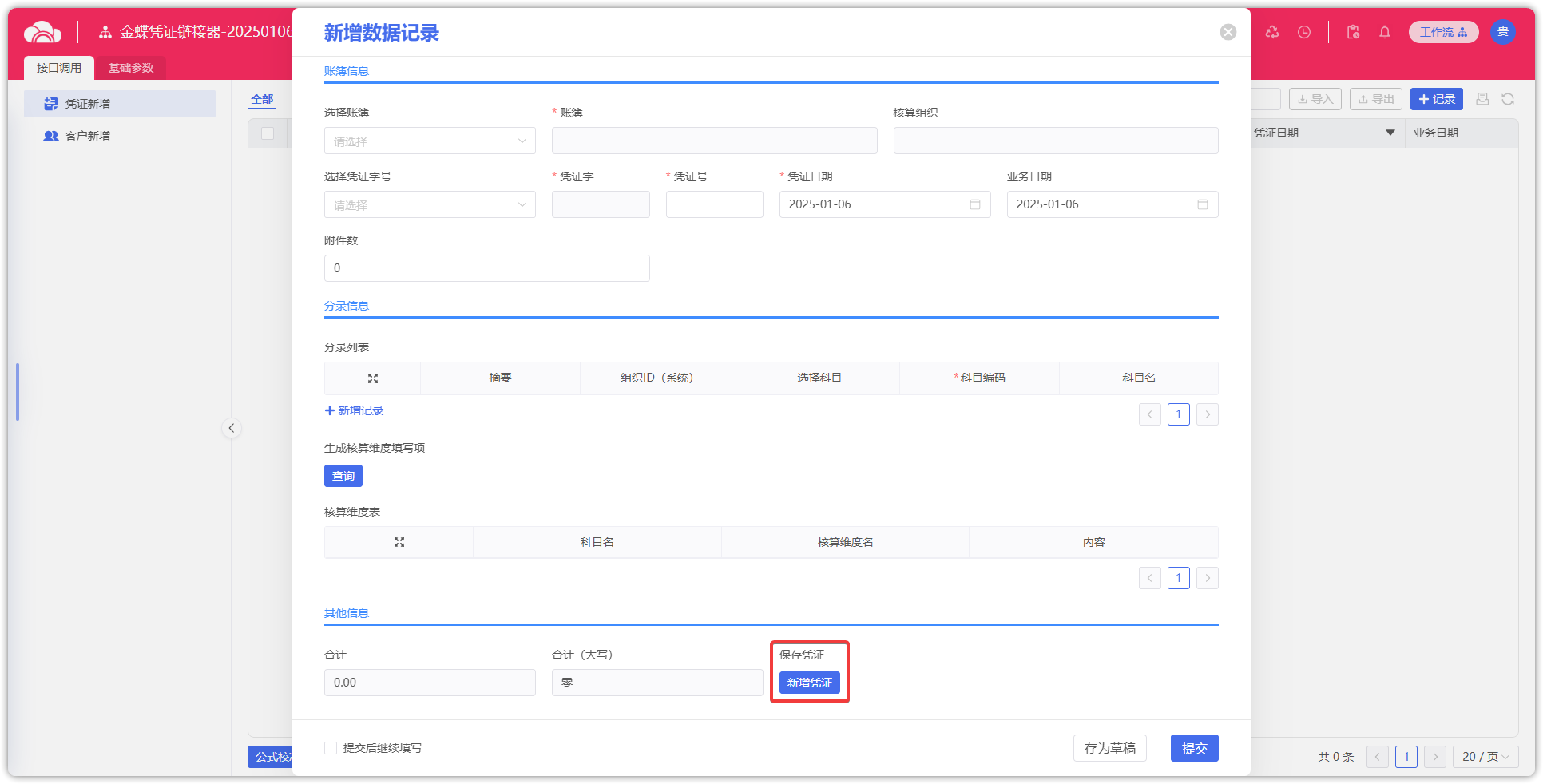 引导填写相关数据,最后点击 “新增凭证” 按钮