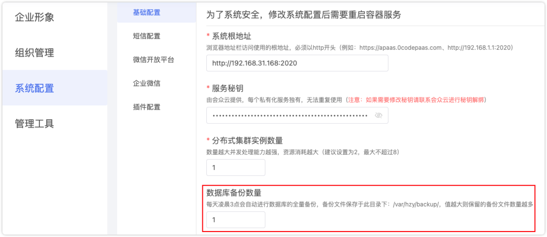 数据库全量备份:在管理后台系统配置 → 基础配置 → 数据库备份数量